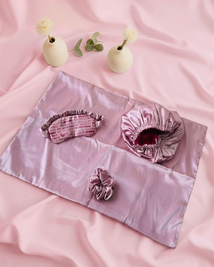 Elaborado en satín licrado de textura sedosa, este kit es una herramienta de cuidado personal que eleva tu bienestar diario: